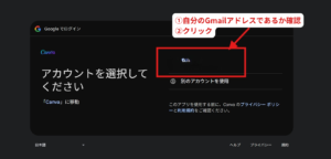 ①「Googleで続ける」ボタンをクリックすると、Googleアカウントの選択画面が表示されます。