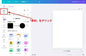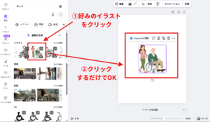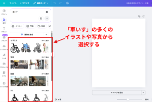 編集画面の左側にある『素材』というボタンを押し、検索窓に「車いす」や「ベッド」と入れてみましょう。