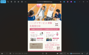 写真部分を「デイサービスの写真」に差し替えれば、カフェ用やイベント用のテンプレートでも十分使えます。
