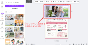 ①テンプレートに最初から入っている写真をクリックし、削除しましょう。